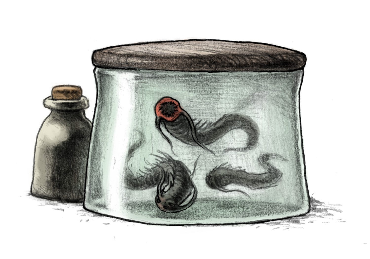 In the waters of the cold North there’s a fearsome creature known as a Sovereign Eel. This creature lays longer than 10 men and has the power to control the mind of its prey to make them easier to hunt. The young Sovereign Eel are like a leech who learned to detect when a creature’s mind was not its own and swarm to feed first on the blood of a captured creature in safety. Many wore a leech behind their ear in battle with the Gods and let the bites save them from subjugation. For the service of their young the Sovereign Eel are no longer hunted, a sacred ally in the north.
