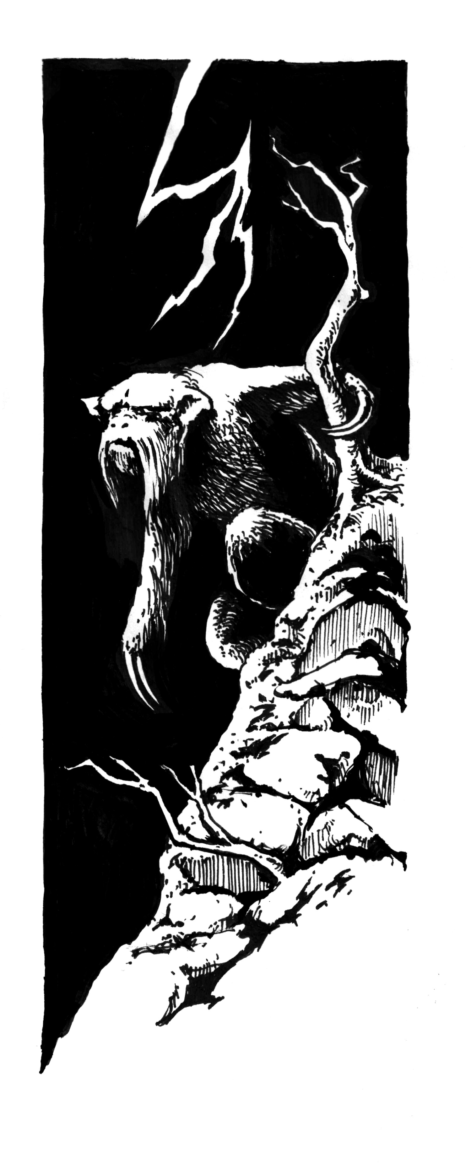 Standing as tall as a man, Ronrath Kobal are always hunched, walking on knuckles of large a muscular front arms with two long claws and walking in squat back legs. Their mouth is hidden by fur but opens terrifyingly wide when they feel threatened.